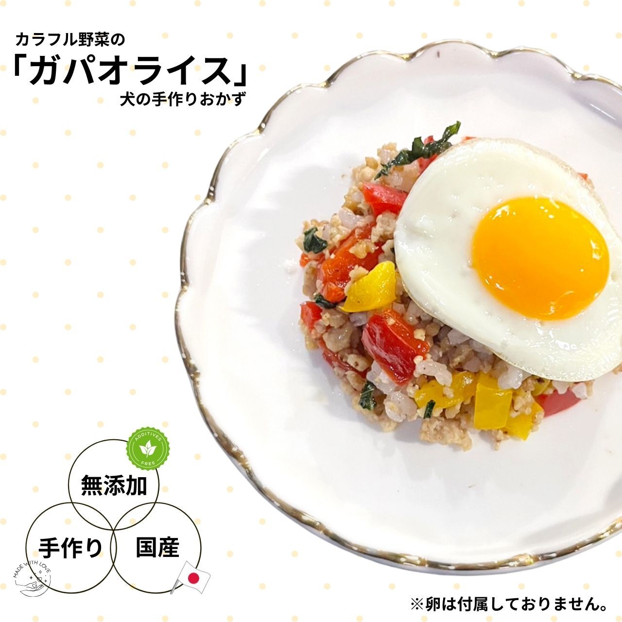 原材料:鶏ももミンチ・白米・パプリカ黄・パプリカ赤・ズッキーニ(時期によりきゅうりに変更)・卵殻パウダー