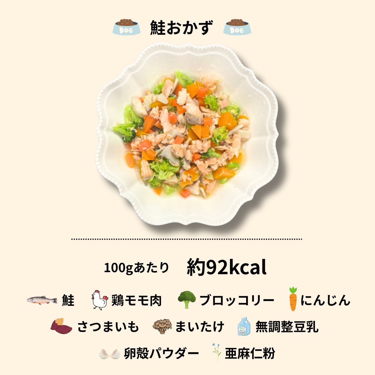 原材料:生鮭・ブロッコリー・にんじん・さつまいも・まいたけ・無調整豆乳 ・卵殻パウダー・亜麻仁パウダー