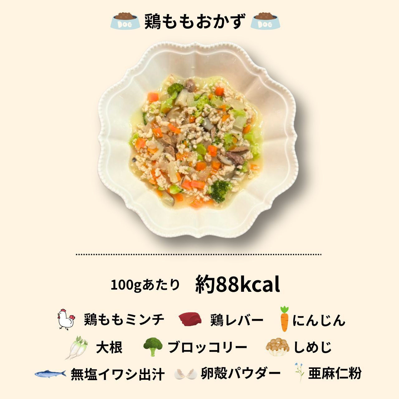 原材料:鶏ももミンチ・鶏レバー・にんじん・大根・ブロッコリー・しめじ・無塩いわし出汁・ 卵殻パウダー・亜麻仁パウダー
