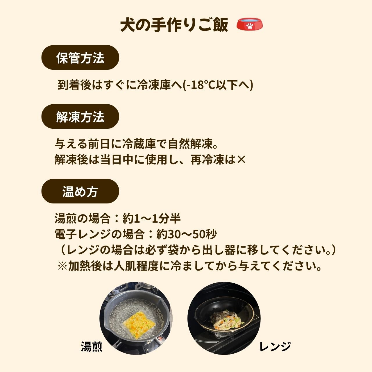 ・前日に冷蔵庫で自然解凍してから温めて与えてください。